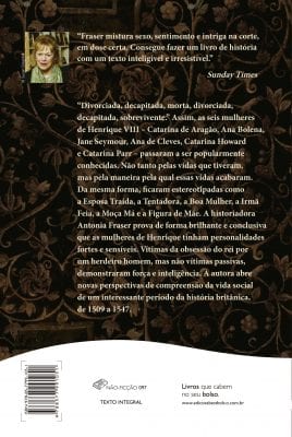 Divorciada, decapitada, morta, divorciada, decapitada, sobrevivente.” Assim foram as seis mulheres de Henrique VIII – Catarina de Aragão, Ana Bolena, Jane Seymour, Ana de Cleves, Catarina Howard e Catarina Parr – passaram a ser popurlamente conhecidas. Não tanto pelas vidas que tiveram, mas pela maneira pela qual essas vidas acabaram. Da mesma forma, ficaram estereotipadas como a Esposa Traída, a Tentadora, a Boa Mulher, a Irmã Feia, a Moça Má e a Figura de Mãe. A historiadora e autora do livro prova de forma brilhante e conclusiva que as mulheres de Henrique tinham personalidades fortes e sensíveis. Vítimas da obsessão do rei por um herdeiro homem, mas não vítimas passivas, demostraram força e inteligência. A autora abre novas perspectivas de compreensão da vida social de um interessante período da história britânica, de 1509 a 1547