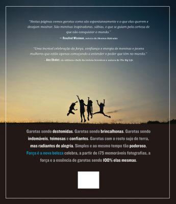 Nas 175 fotos Força é a nova beleza, você vai ver meninas empoderadas, engraçadas, aventureiras, assertivas, barulhentas e criativas. Garotas que amam esportes e garotas que amam artes. Guerreiras. Sobreviventes. Garotas com os pés calejados em sapatilhas de balé e garotas usando camisas de futebol. Garotas desafiadoras e orgulhosas, mostrando suas cicatrizes, cabelos bagunçados e pés encardidos. Garotas aconchegadas no sofá, brincando ao ar livre, reivindicando sua independência diante das adversidades, cantando e tocando instrumentos. Este livro captura sua essência em palavras e sorrisos, com fotografias que inspiram — e servem como prova da máxima de que o que somos por dentro é o que conta.